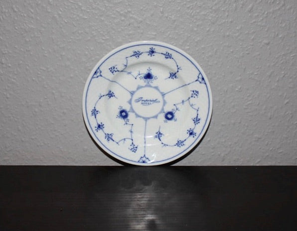 Assiett från Bing & Gröndal i serien musselmalet. Denna är dessutom gjord för Imperial Hotel och har deras logotyp på sig. Den är i mycket fint skick.